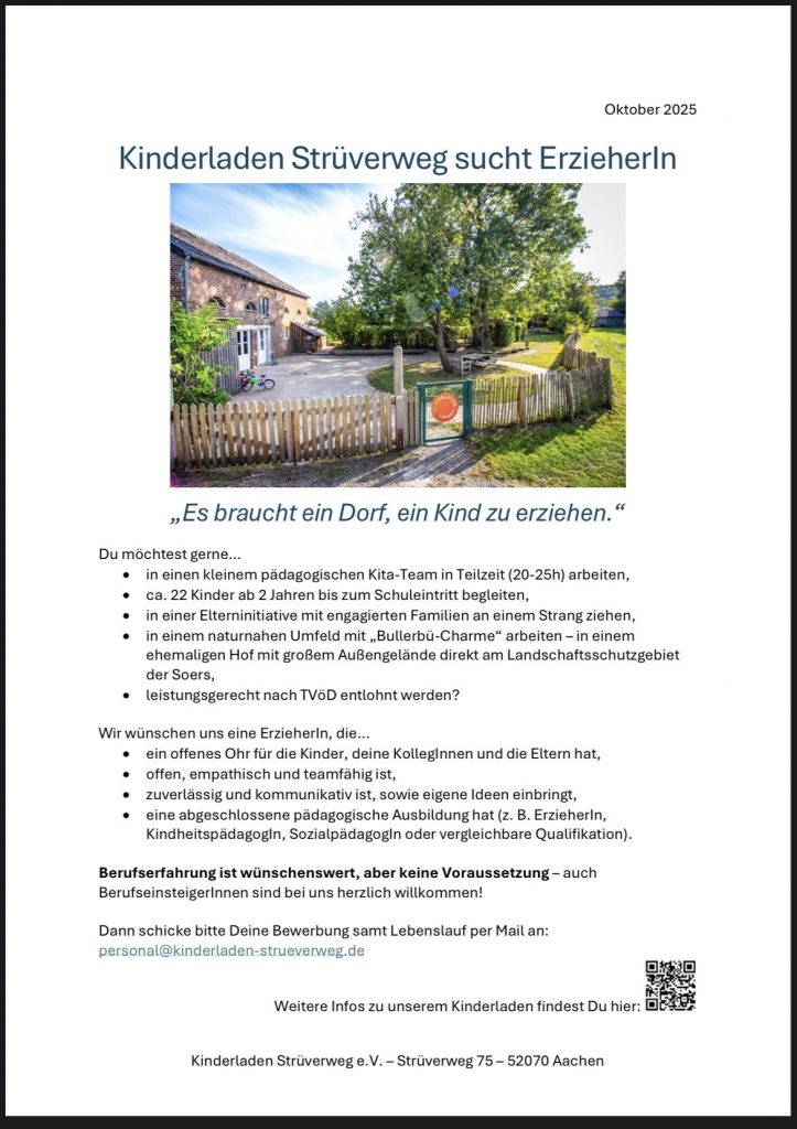 Wir suchen ab sofort eine neue Erzieher:in und freuen uns über Bewerbungen! Infos zur Stelle und zur Bewerbung findet ihr hier: